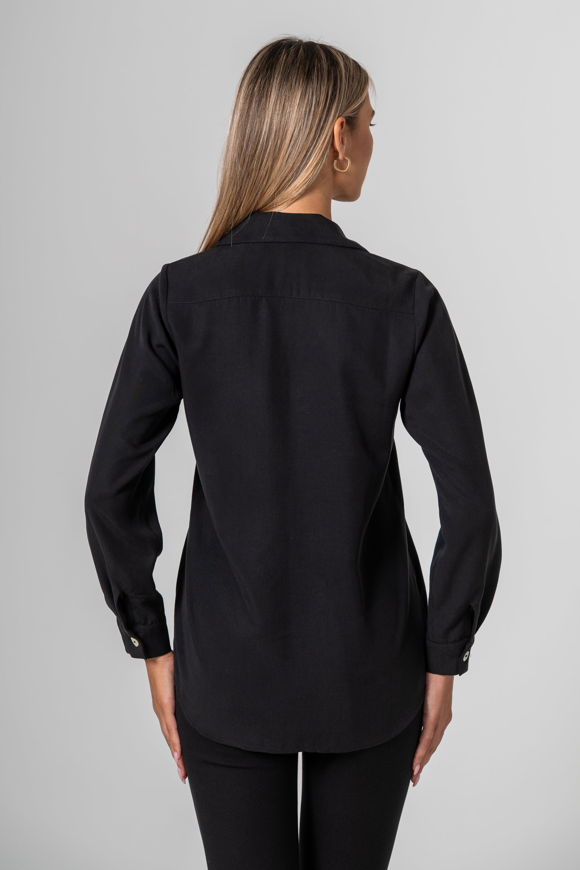 Collared long-sleeve blouse in Tencel, twill, featuring front patch pockets and mother-of-pearl buttons.